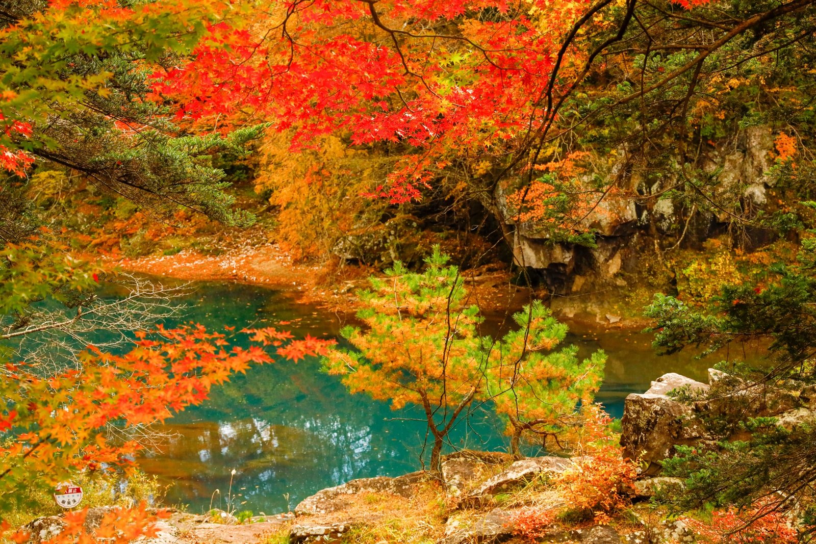 Brilliant red and gold leaves frame the gorge,