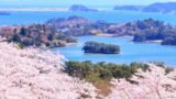 Cherry blossoms bloom near the stream, adding soft pink to the bridge’s red.