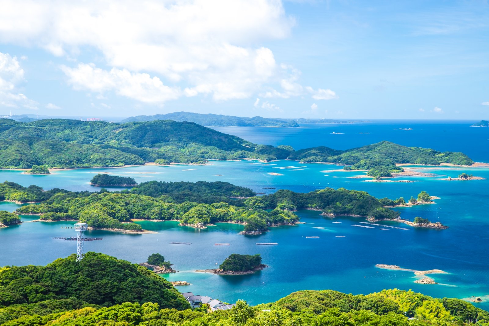 the Kujūkushima Islands (九十九島, “Ninety-Nine Islands”), a cluster of over 200 small islands scattered across the tranquil blue waters of the Saikai Sea.