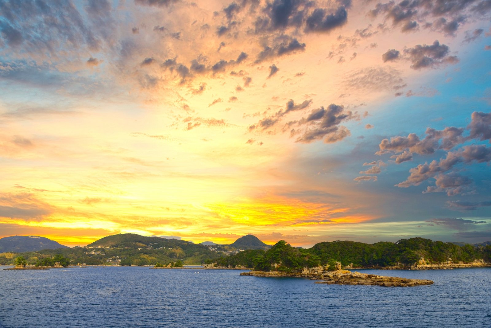 As the sun sets behind the islands, the entire horizon glows in shades of orange and purple — one of Japan’s most captivating sunset views.